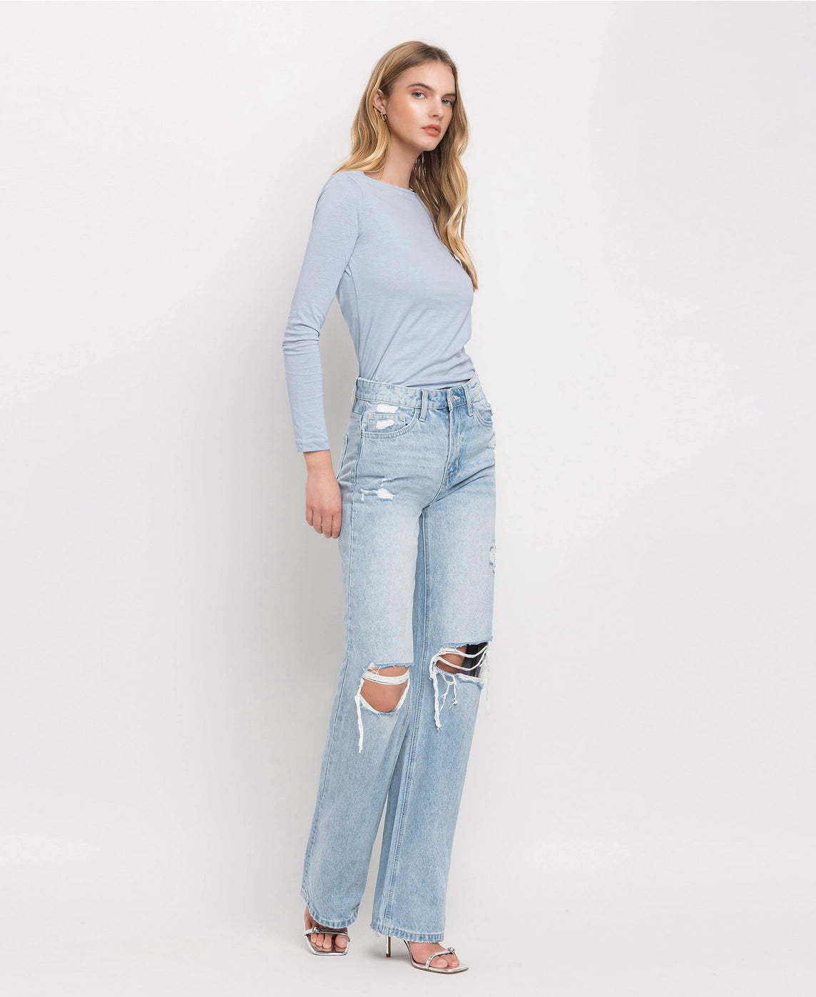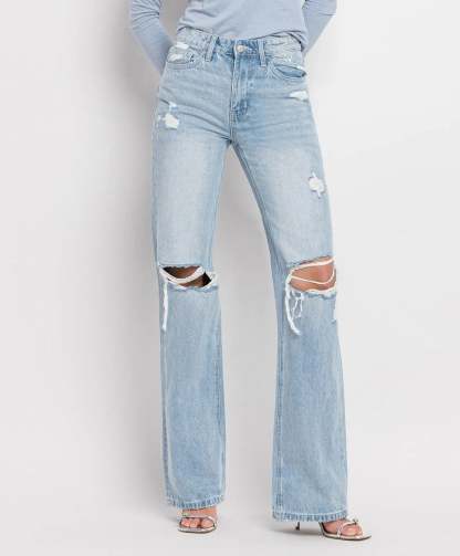 90's vintage super high rise flare jeans Non stretch denim, super high rise waist, 90's vintage style, distressed detail, full length, flare jeans F. Rise: 11 1/4" / inseam: 34" / leg opening: 20"