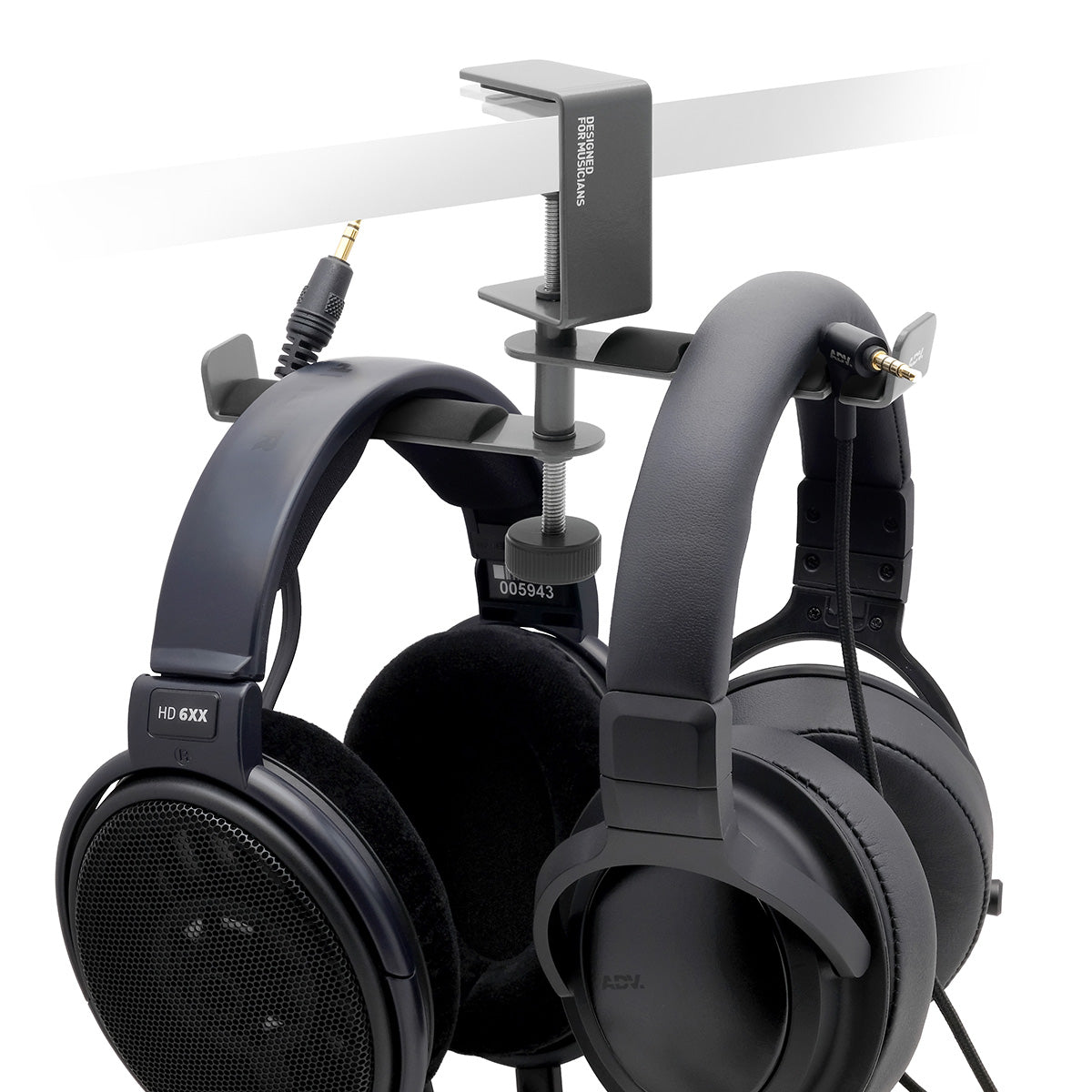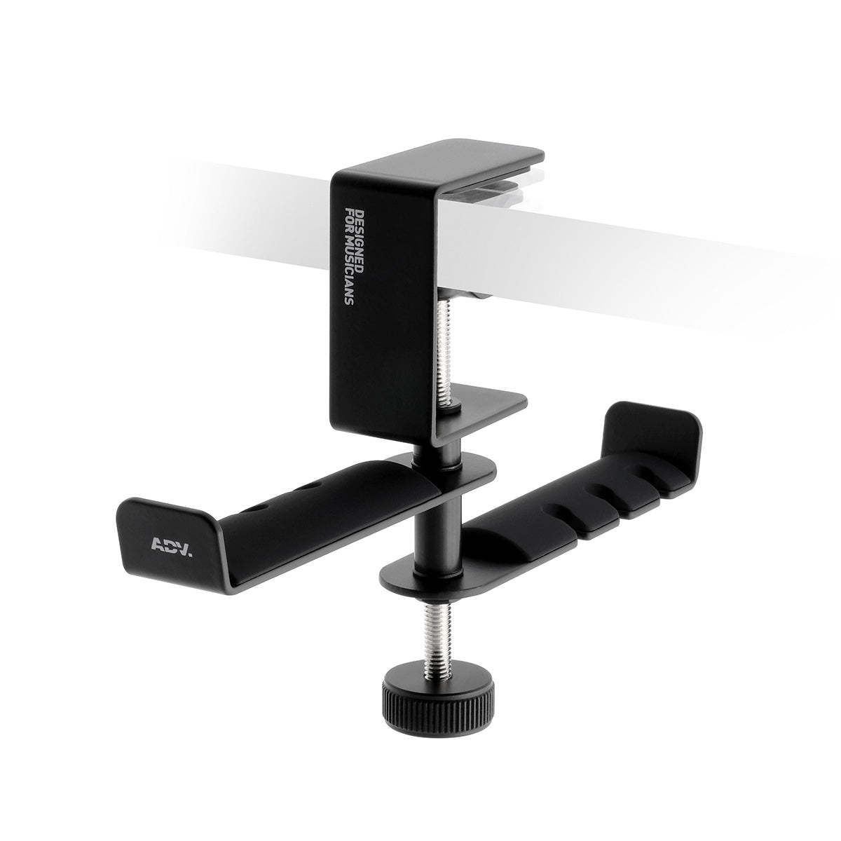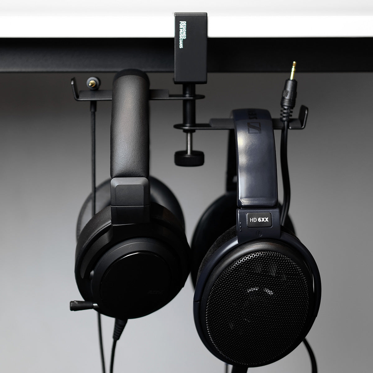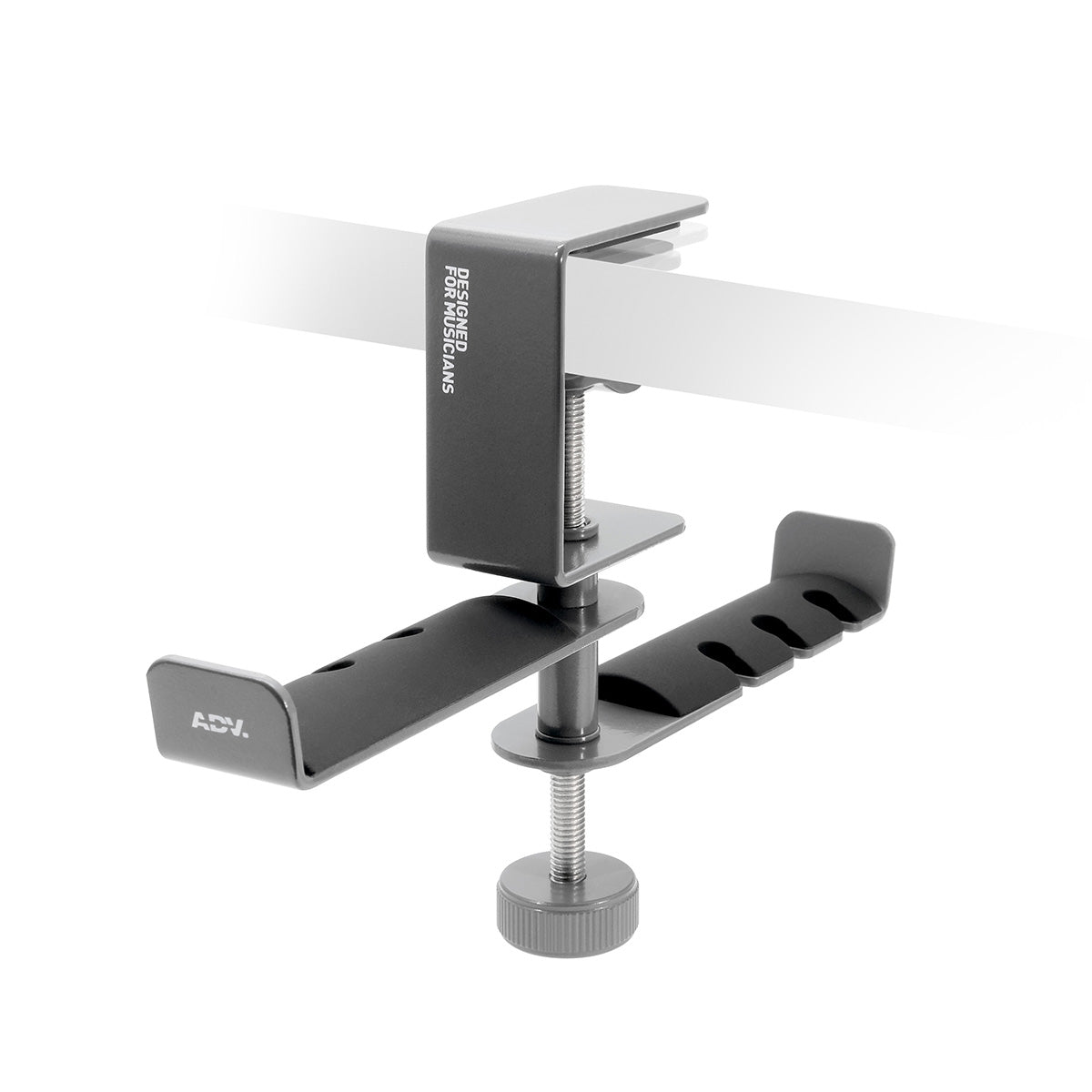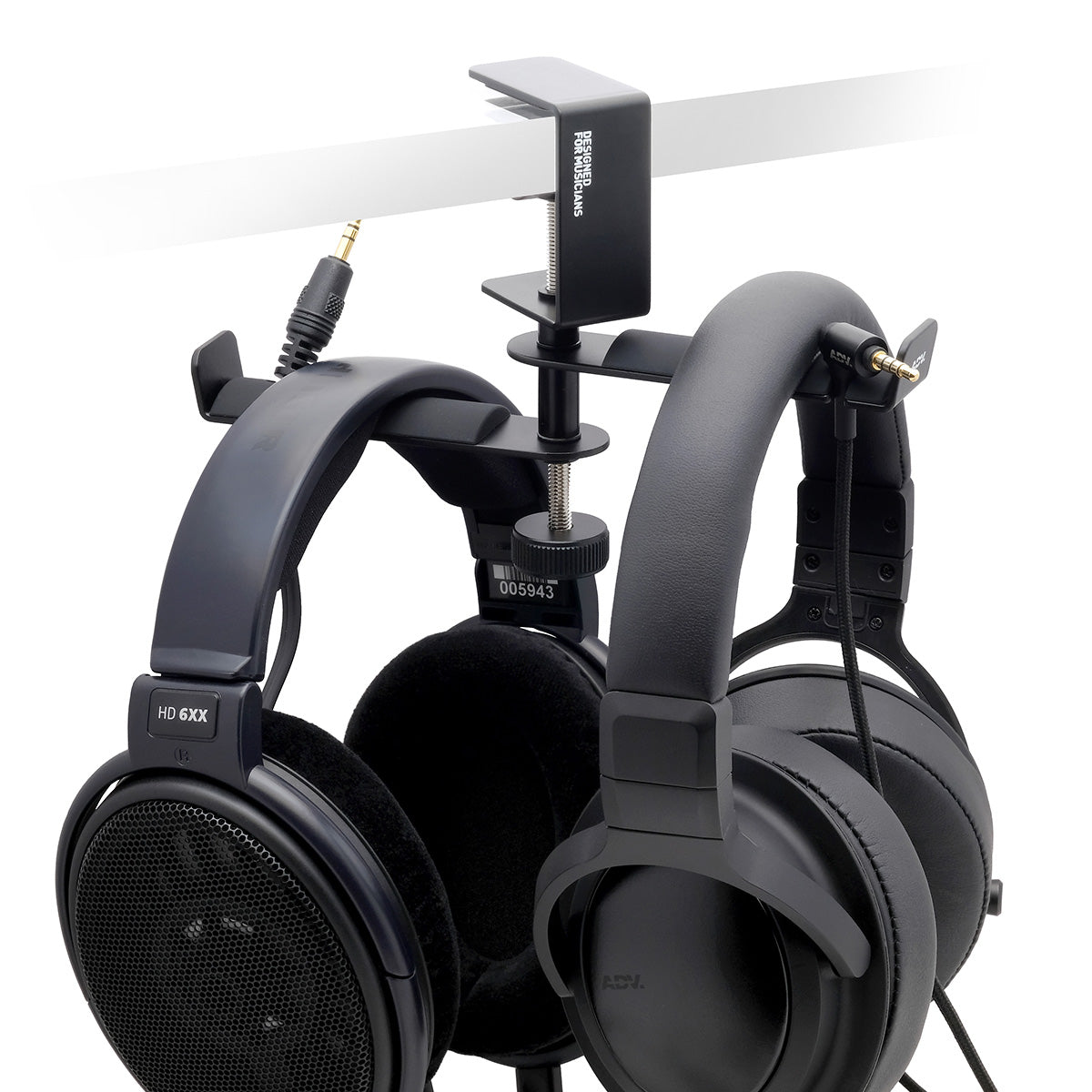 ADV. Dual Suspension twin headphone hanger tucks under your desk and provides a versatile storage option for two of your favorite headphones with its 360-degree rotating neck.