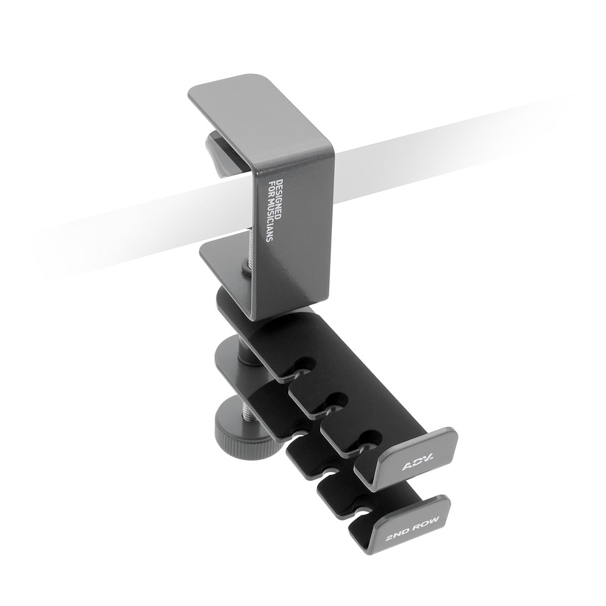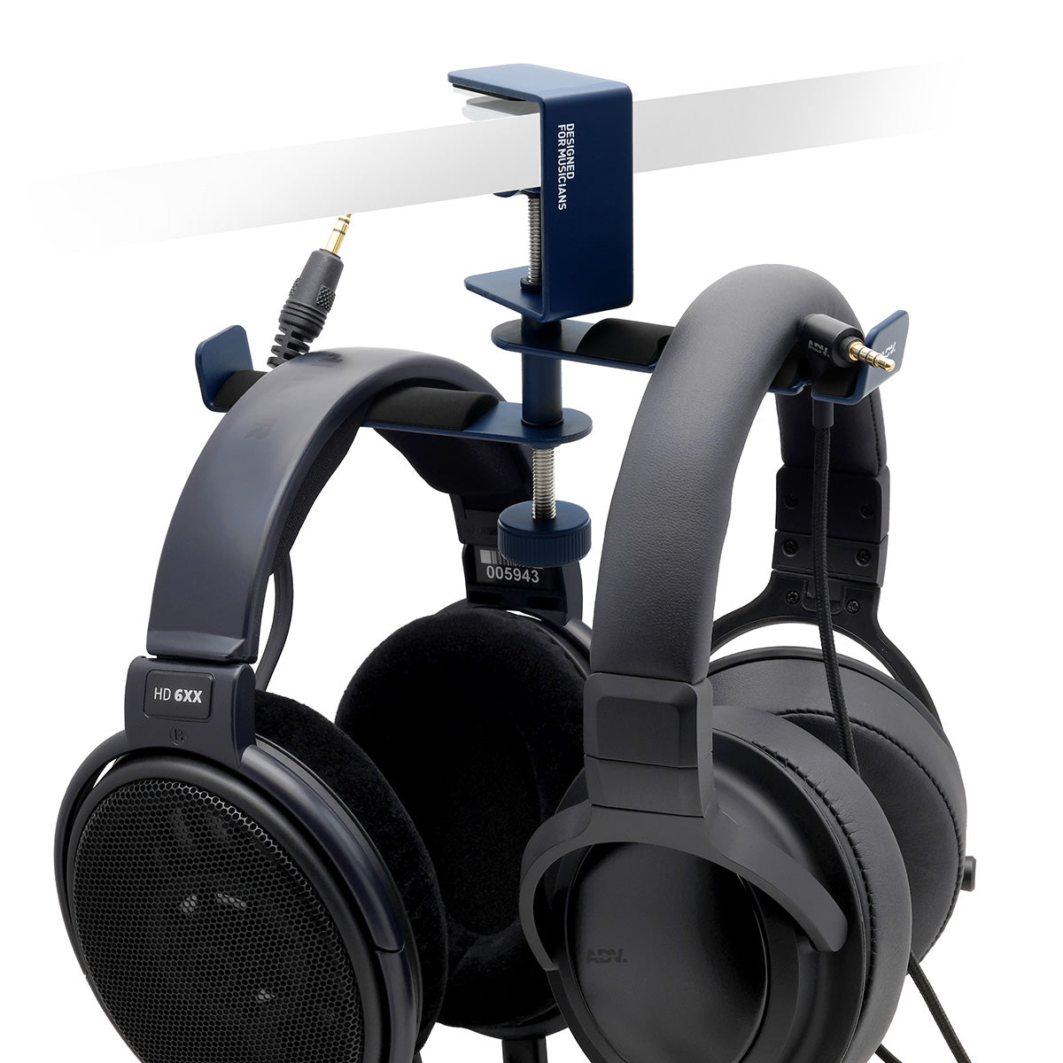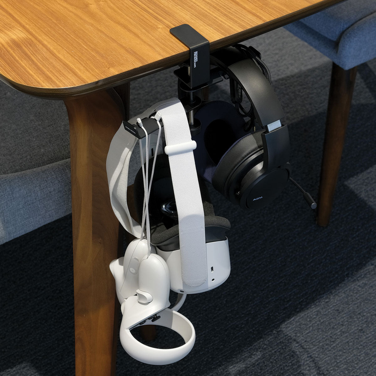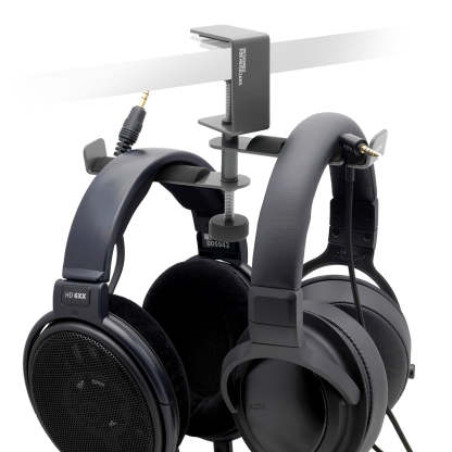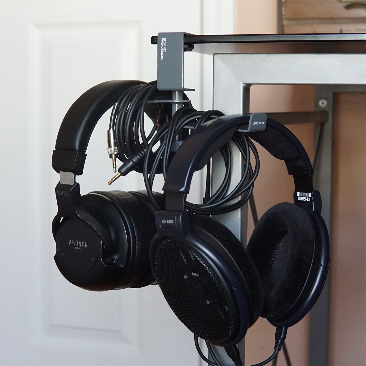 ADV. Dual Suspension twin headphone hanger tucks under your desk and provides a versatile storage option for two of your favorite headphones with its 360-degree rotating neck.