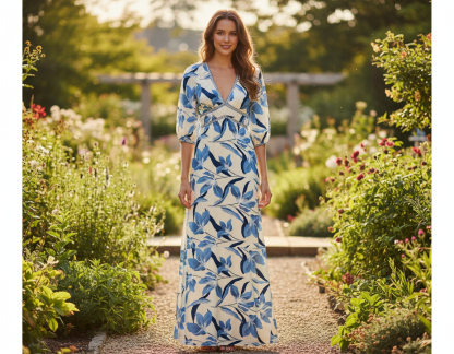 This sophisticated maxi dress combines elegance with thoughtful design details. The flattering V-neckline draws the eye upward, while delicate shirring at the neckline adds textural interest and subtle definition. Distinctive elbow-length raglan sleeves create a modern silhouette with gentle volume at the cuffs. The high-waist cut is anchored by elastic shirring that cinches the midsection, creating a refined hourglass shape. Perfect for elevated occasions or refined everyday wear, this piece balances contemporary styling with timeless appeal.