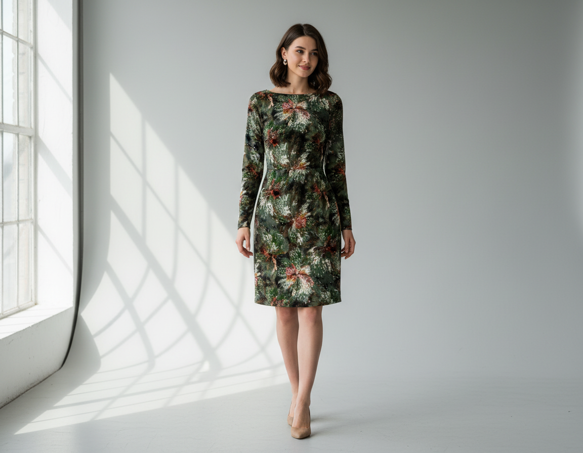 This long sleeve fitted mini dress features a classic boat neckline that frames the shoulders elegantly. The streamlined silhouette hugs your curves with precision, while subtle shirring at the waist creates gentle definition and visual interest. Crafted for a polished, versatile look, this piece transitions seamlessly from day to evening occasions. The fitted construction and refined neckline make it an essential addition to any wardrobe, offering timeless sophistication with contemporary styling.