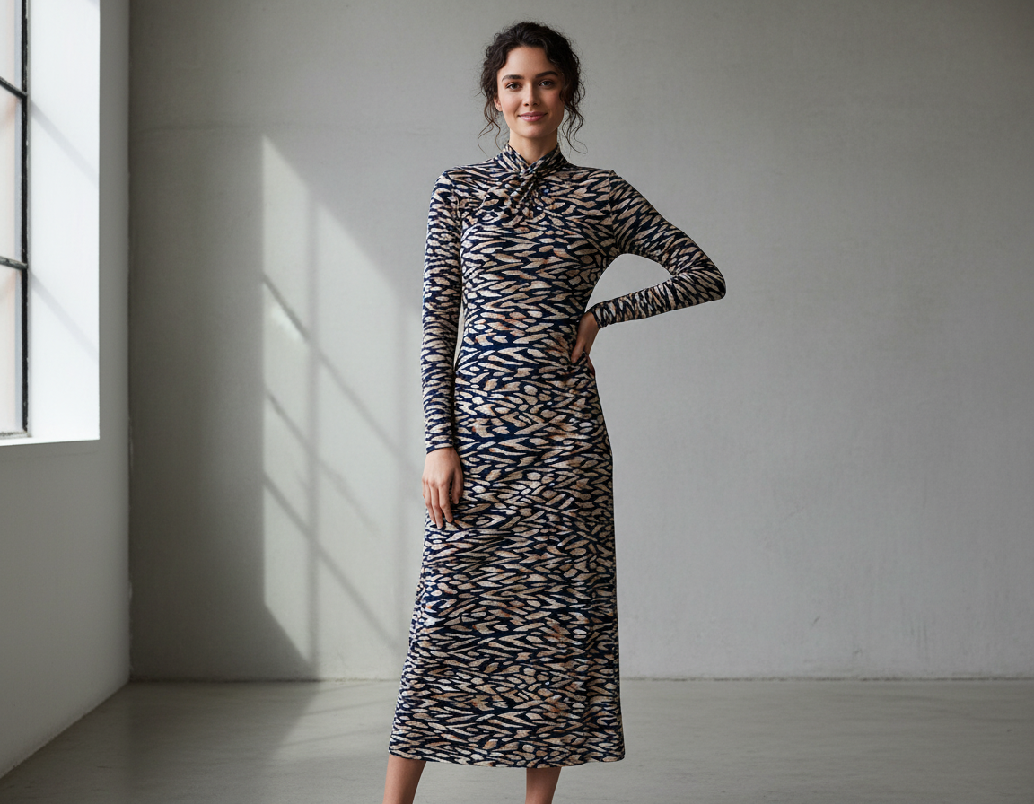 This long sleeve fitted dress combines sophisticated tailoring with modern design details. The twisted front neckline and mock neck create an elegant focal point, while the fitted silhouette is enhanced by a defined waist seam that flatters your frame. Subtle shirring across the bodice adds texture and dimension without compromising the streamlined fit. Perfect for elevated everyday wear or professional settings, this piece transitions seamlessly from office to evening occasions with its polished construction and refined aesthetic.