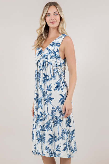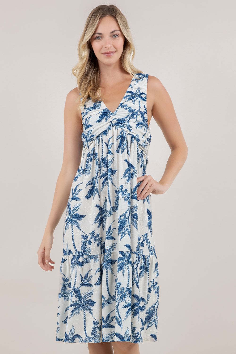 This sleeveless midi dress features a flattering V-neckline and sculptural bubble bodice that creates dimension through the torso. Strategic shirring throughout the bodice provides gentle shaping and visual interest, while a V-shaped seam positioned just under the bust enhances your silhouette. The tiered skirt adds movement and texture, making this piece both sophisticated and effortlessly wearable for elevated occasions or refined everyday styling.
