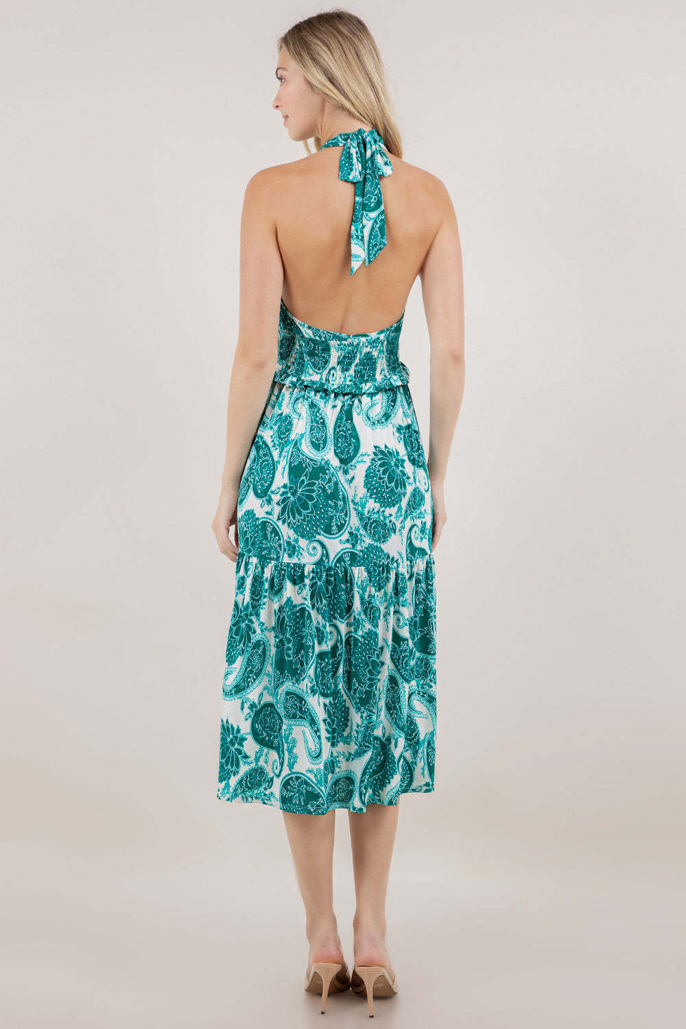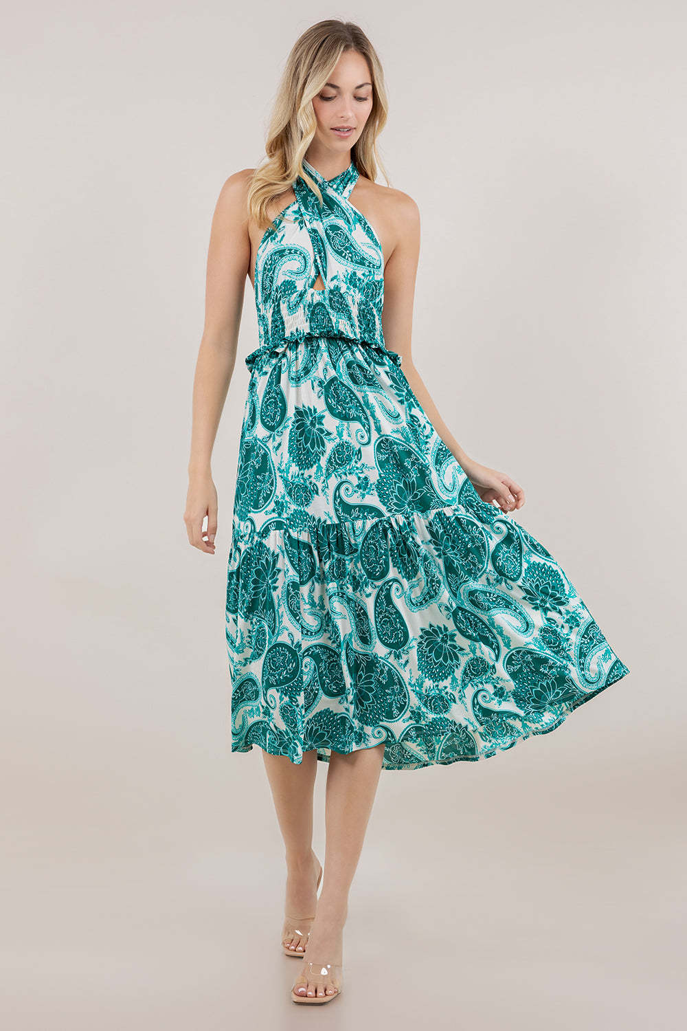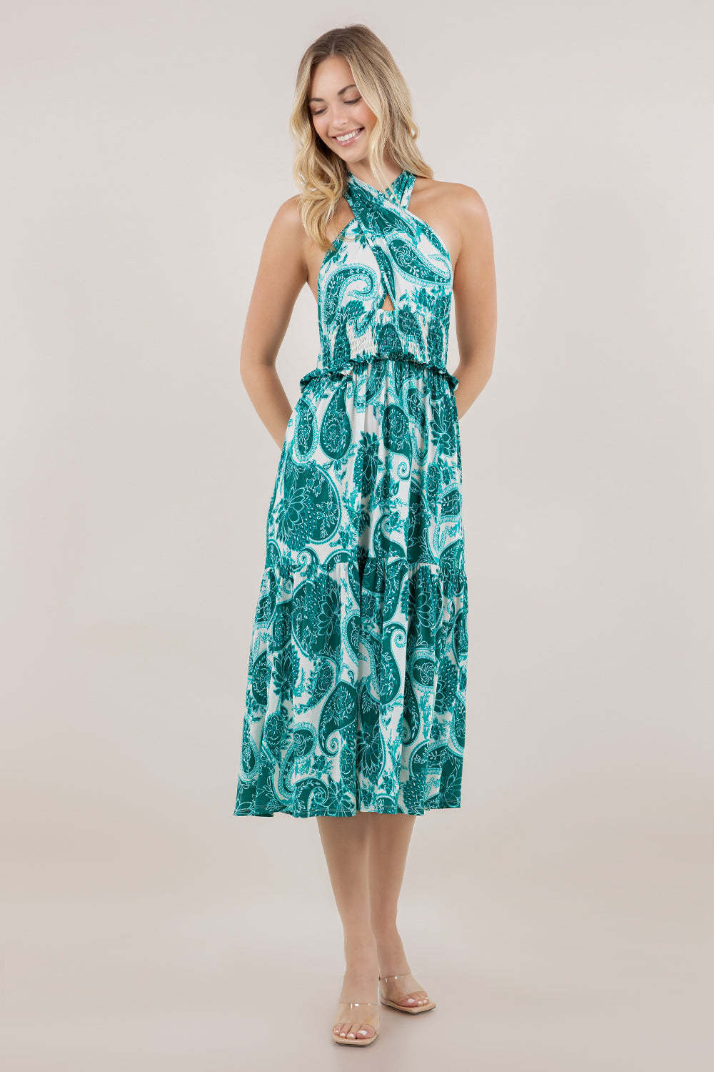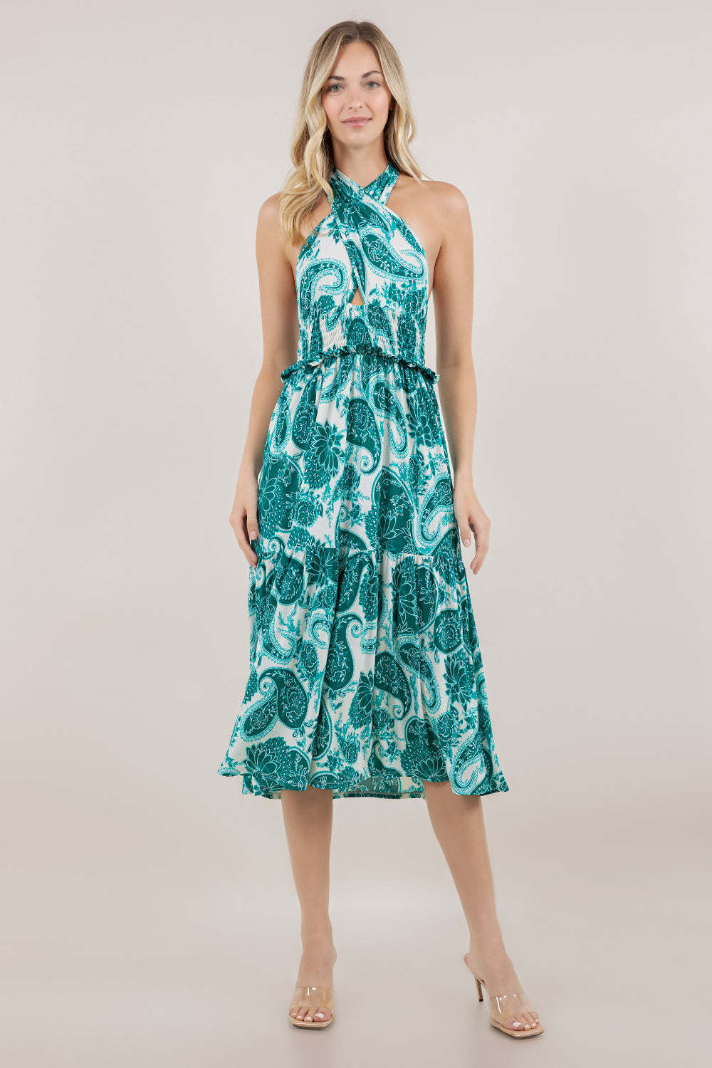 This sleeveless crossover halter dress delivers polished style with thoughtful construction details. The adjustable tie closure at the back neck allows you to achieve your ideal fit, while the crossover halter design creates a flattering neckline. A keyhole cutout on the front adds contemporary visual interest. Elastic smocking at the waist provides shaping and comfort, complemented by delicate ruffle trim that enhances the silhouette. The tiered skirt creates dimension and movement, while the knee-length cut offers versatility for various occasions. An ideal choice for those seeking refined elegance with modern design elements.