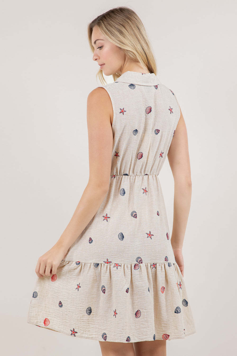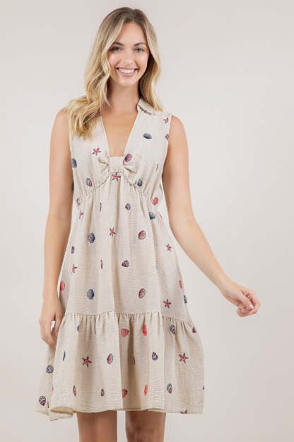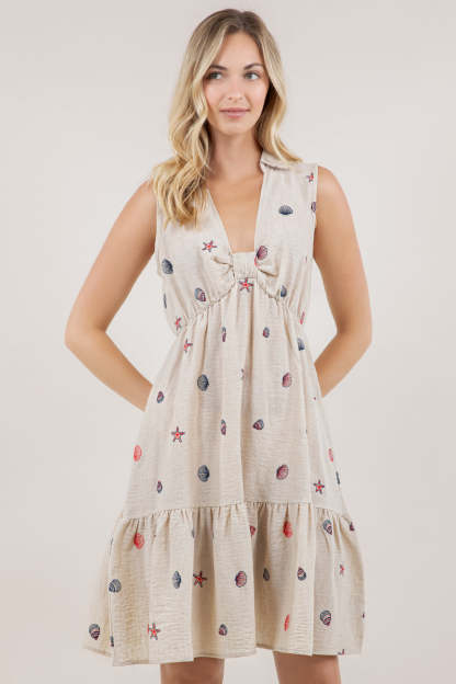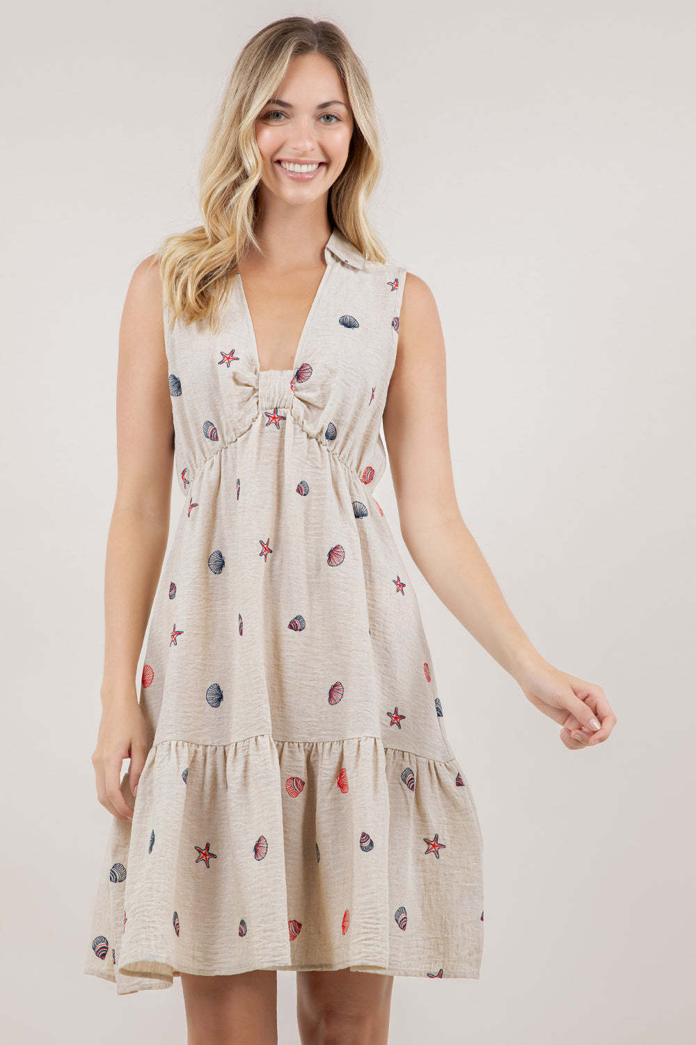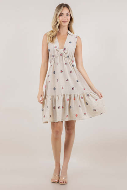 This sleeveless halter dress combines classic tailoring with contemporary styling. The structured shirt collar and V neckline create a sophisticated frame, while the decorative knot detail at the bust adds visual interest and dimension. The high-waisted silhouette elongates the frame, flowing into a flattering A-line tiered skirt that offers movement and volume. Perfect for elevated casual occasions or dressed-up events, this piece balances refined elegance with modern design elements.