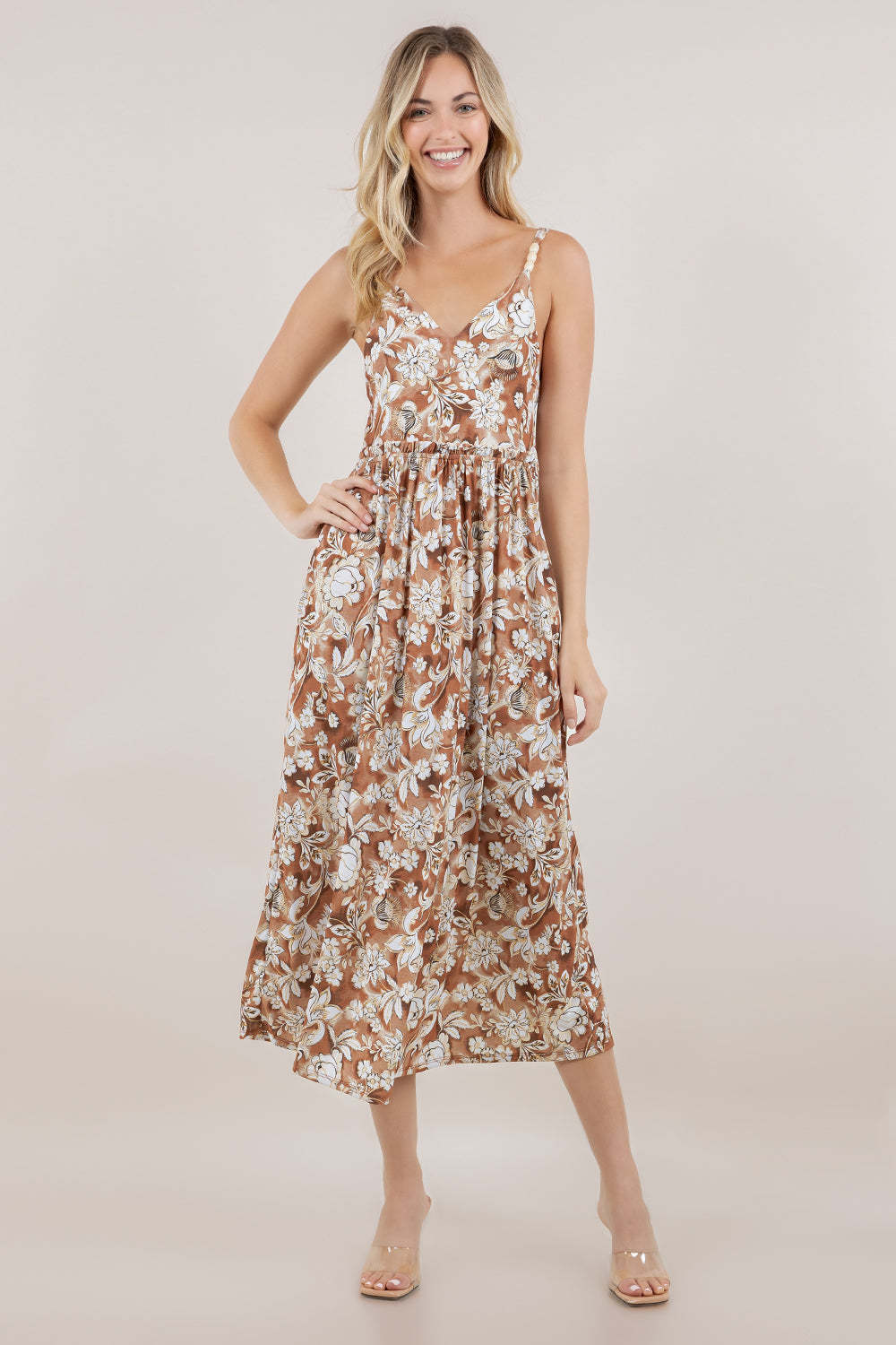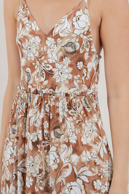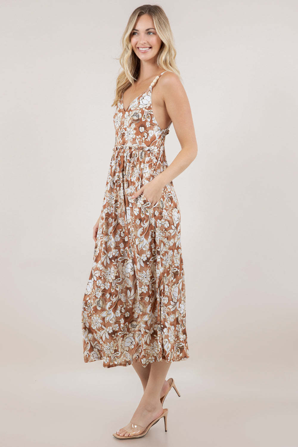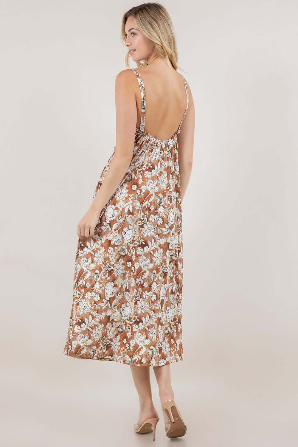 Effortless elegance meets practical design in this sleeveless maxi dress. Delicate spaghetti straps frame a flattering deep V neckline, while elastic shirring at the front and back waist creates subtle definition without sacrificing comfort. The high-waist silhouette and flowing loose fit provide graceful movement and a universally flattering drape. Functional side pockets add everyday utility to this versatile piece, making it equally suited for casual outings or dressed-up occasions.