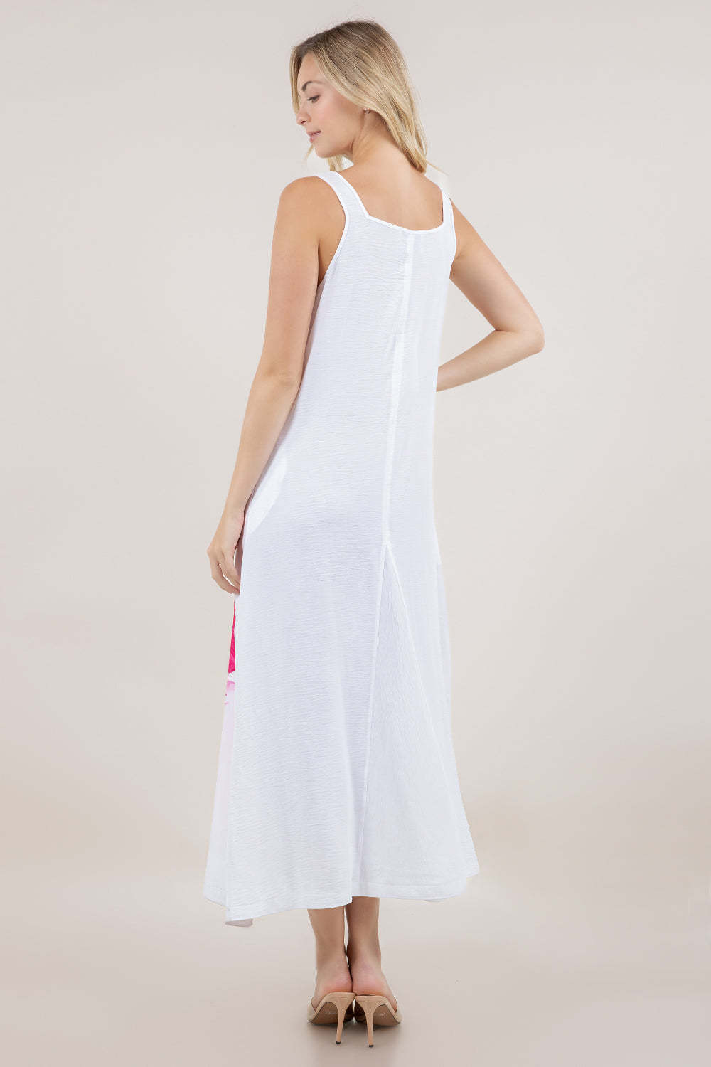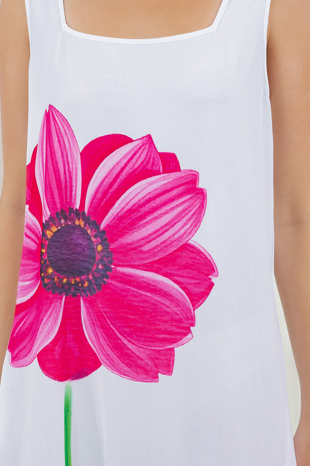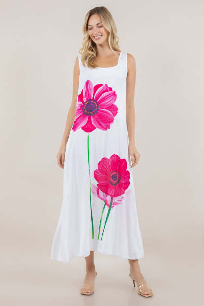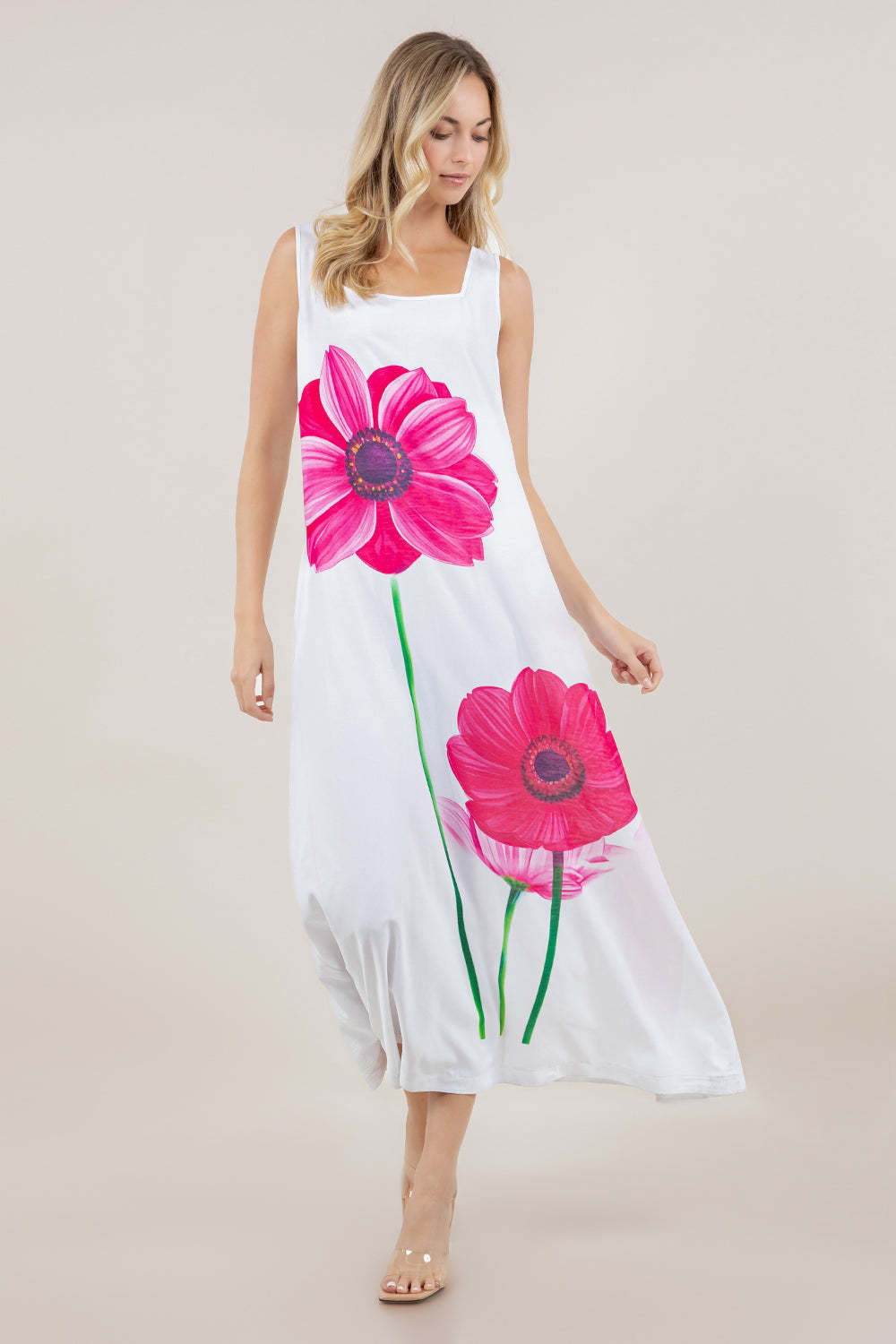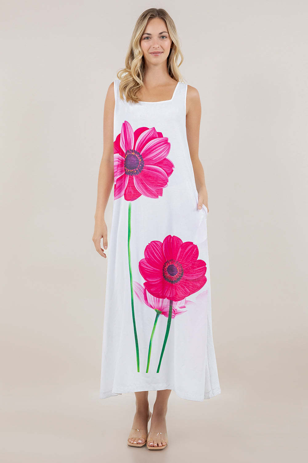 This sleeveless maxi dress combines architectural design with fluid movement. The structured square neckline and A-line silhouette provide a polished foundation, while strategically placed godet inserts create graceful flow from hip to hem. A striking large-scale floral sublimation print commands attention, making this piece a statement-worthy addition to any wardrobe. Ideal for those seeking sophisticated style with dynamic, eye-catching detail.