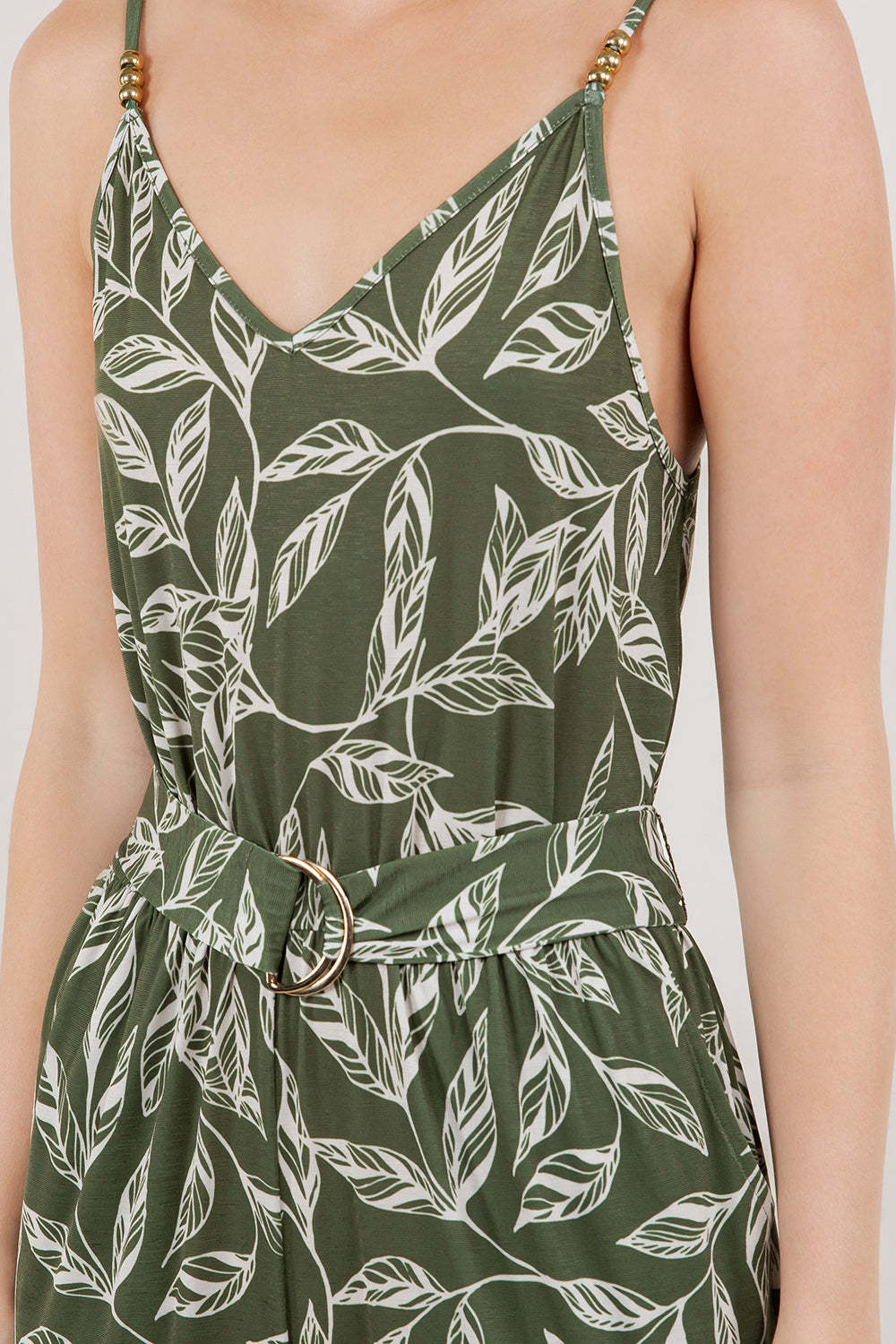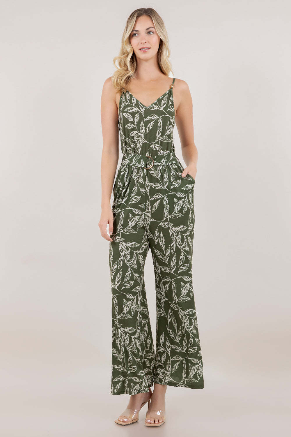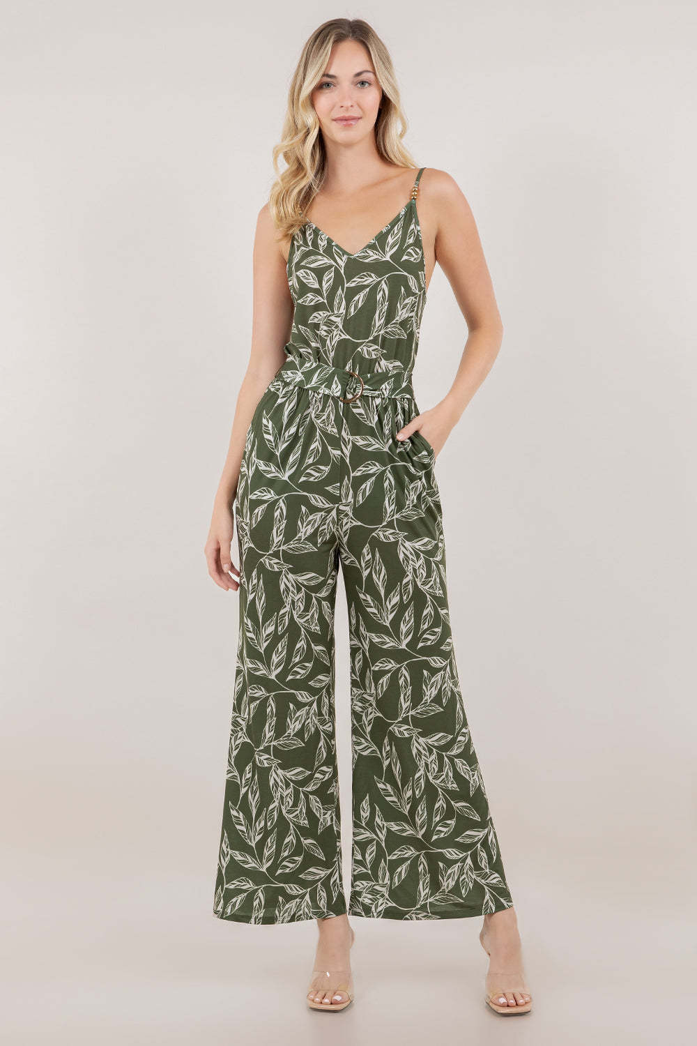Elevate your wardrobe with this sophisticated sleeveless jumpsuit, designed for effortless elegance. The flattering V-neckline and delicate spaghetti straps trimmed in gold create a refined silhouette, while wide-leg pants offer comfortable movement and a contemporary aesthetic. Practical side pockets provide everyday functionality, and the adjustable waist belt featuring a gold D-ring cinches the fit for a polished, put-together look. Perfect for transitioning from day to evening occasions with understated style.