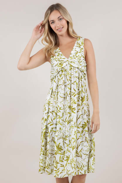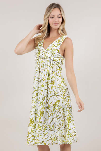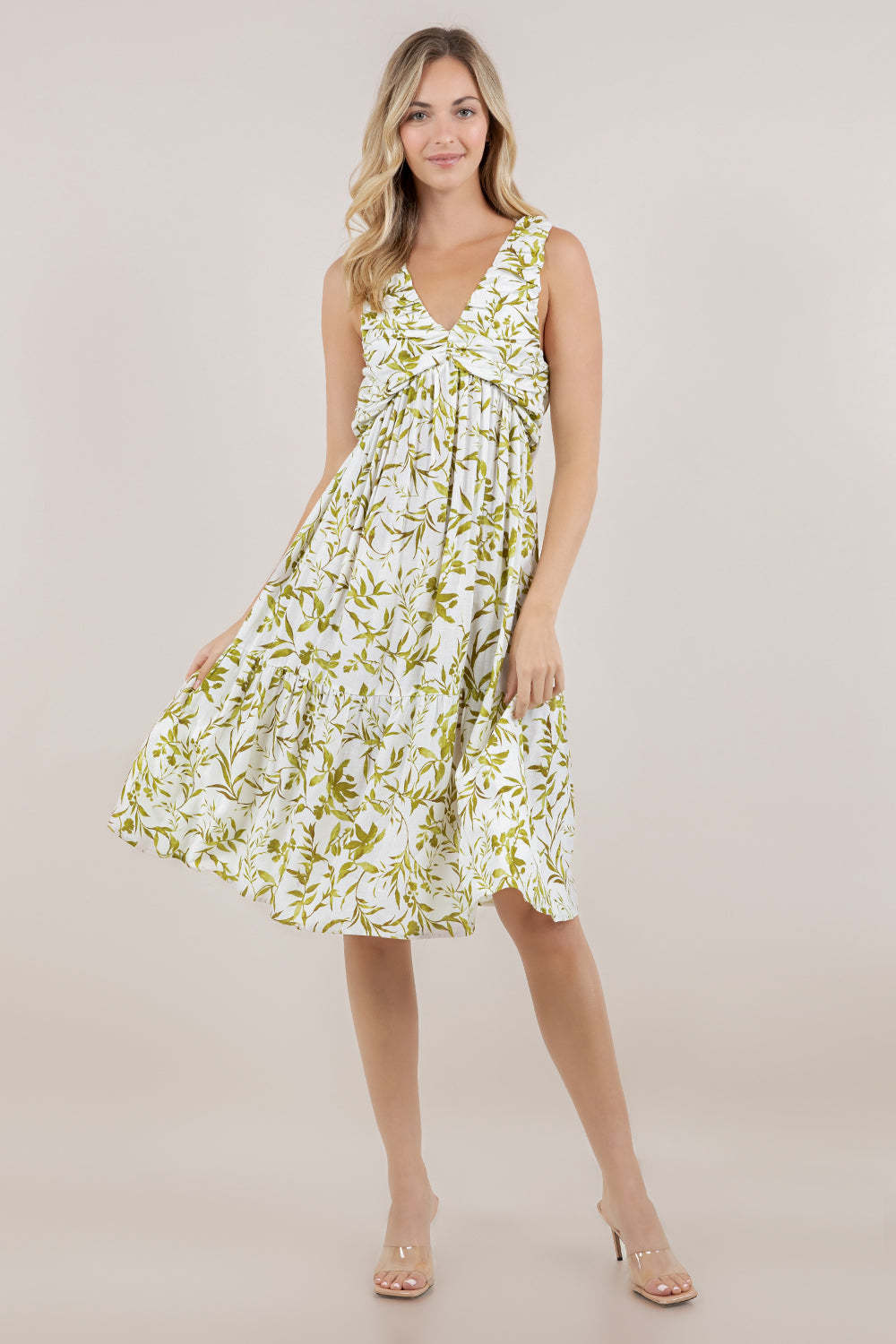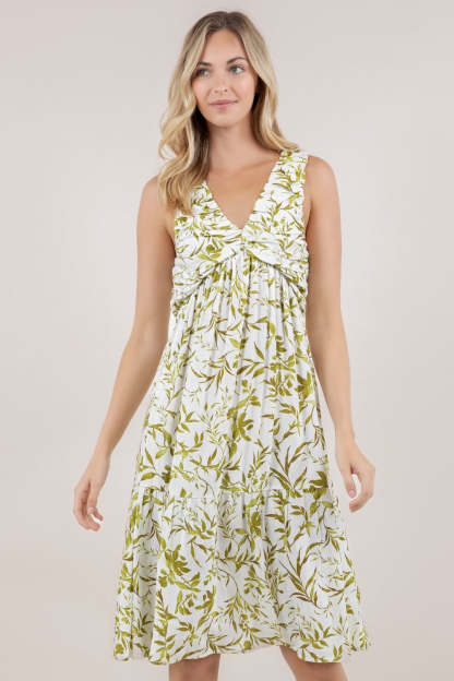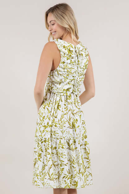 This sleeveless midi dress features a flattering V-neckline and sculptural bubble bodice that creates dimension through the torso. Strategic shirring throughout the bodice provides gentle shaping and visual interest, while a V-shaped seam positioned just under the bust enhances your silhouette. The tiered skirt adds movement and texture, making this piece both sophisticated and effortlessly wearable for elevated occasions or refined everyday styling.
