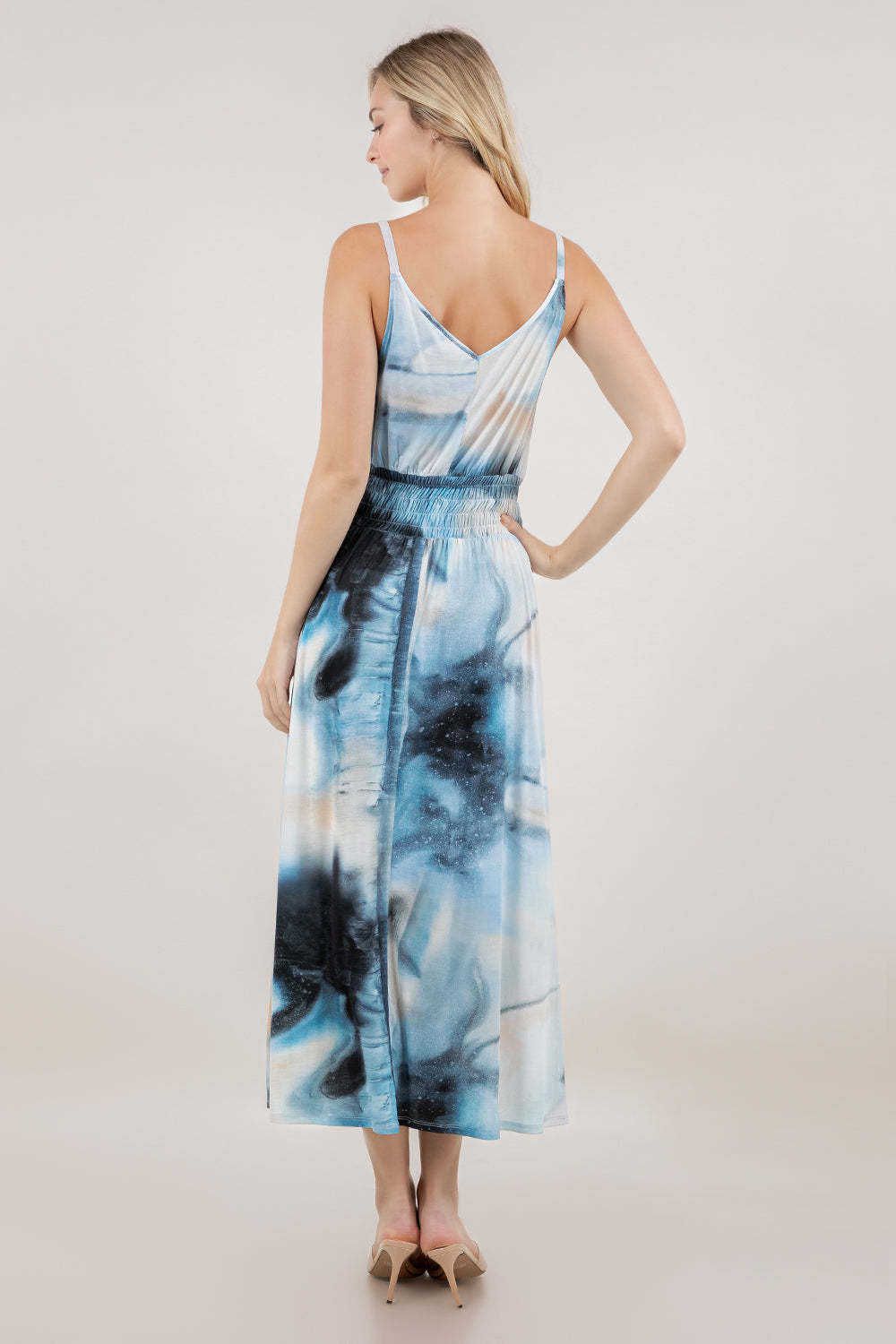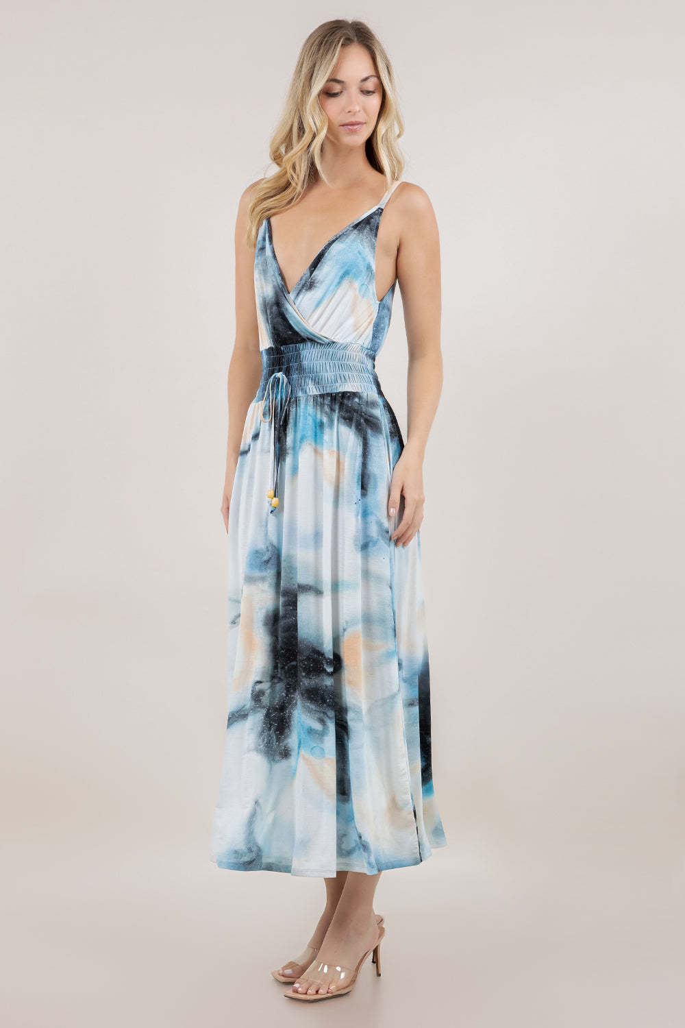 This sleeveless maxi dress features a surplice V-neckline for a flattering fit and an elastic smocked waist with a drawstring, allowing personalized comfort and shape. Its A-line silhouette offers effortless movement and a chic, versatile look suitable for various occasions.
