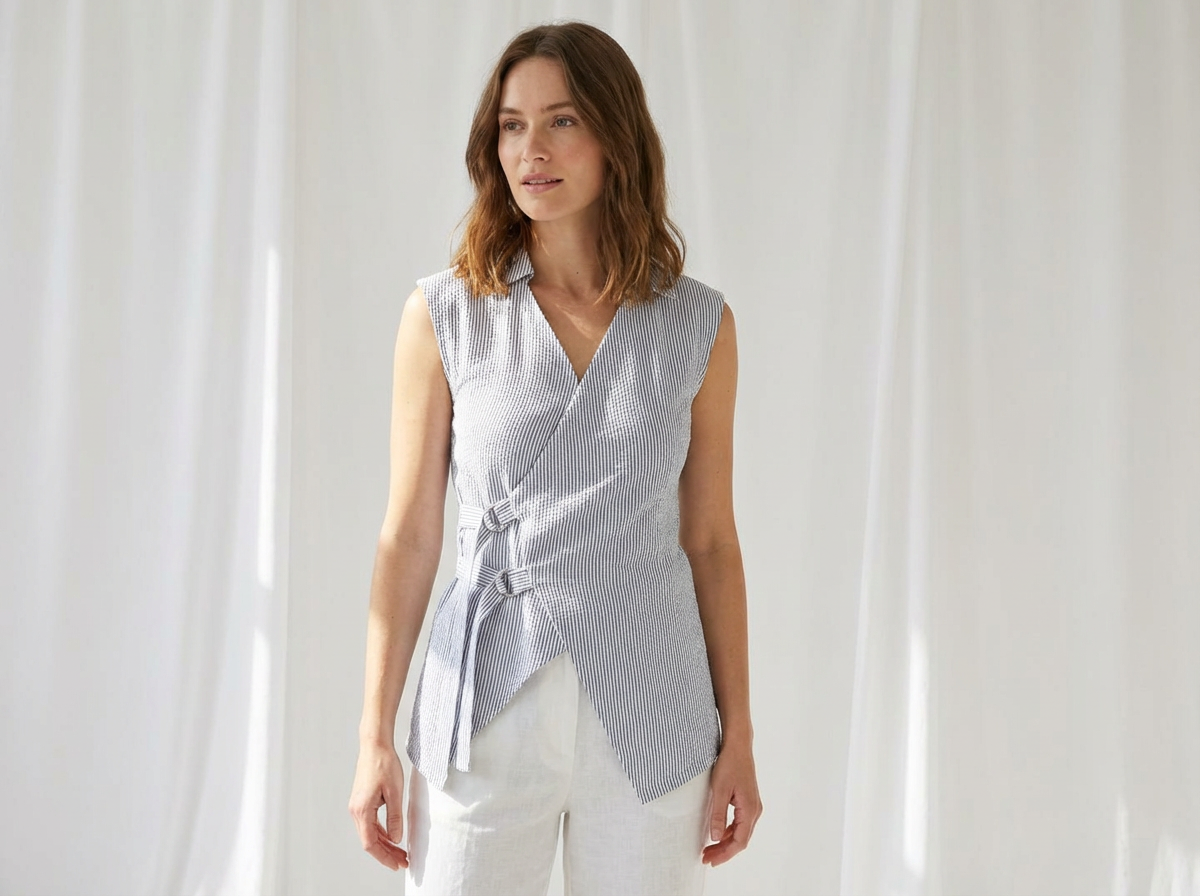 This sleeveless wrap top features a sophisticated V-neck with collar detail and a structured back yoke enhanced by princess seams for a refined silhouette. Two adjustable straps with D-ring hardware provide customizable fit and styling versatility. The wrap construction creates flattering draping while the back seaming adds dimension and support. Perfect for layering or wearing solo, this striped design transitions seamlessly from office to weekend wear.