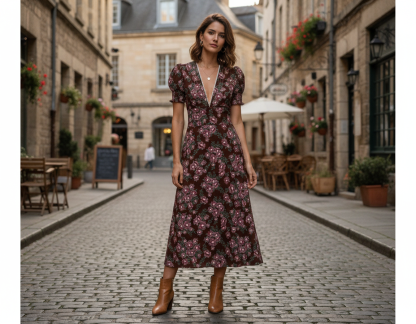 This midi dress combines romantic details with flattering silhouette. Short puff sleeves feature elastic smocking for gentle volume, while the deep V neckline is adorned with delicate crochet trim and pleated accents. The elastic smocked waistband with ruffle trim defines the waist beautifully, flowing into a full A-line skirt that moves with ease. Perfect for elevated casual occasions or dressed-up events, this piece balances feminine design elements with sophisticated proportions.