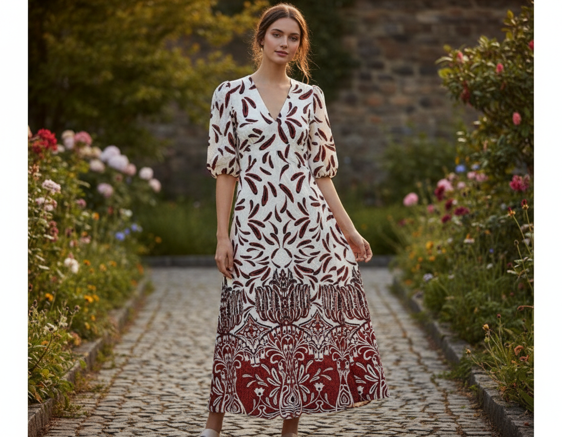 This sophisticated midi dress combines flattering silhouette details with refined design elements. The deep V neckline and curved waist yoke create a streamlined shape, while delicate shirring throughout adds subtle texture and dimension. Bubble sleeves provide a contemporary touch with gentle volume. A decorative tie with tassel details adorns the back, offering an unexpected finishing flourish. The border print adds visual interest and movement to the piece. Perfect for elevated casual occasions or polished daytime events, this dress balances structure with graceful draping for a versatile wardrobe essential.