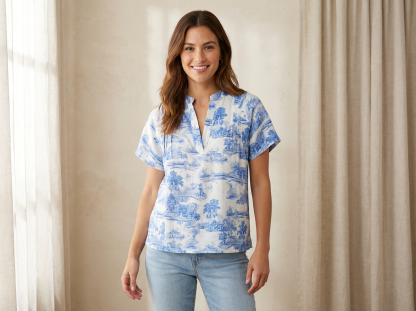 This raglan pintuck top features short bell-shaped sleeves and a loose fit for comfortable wear. Designed with a half placket and collar stand, it offers a refined silhouette. Pintuck details add subtle texture, enhancing its style.