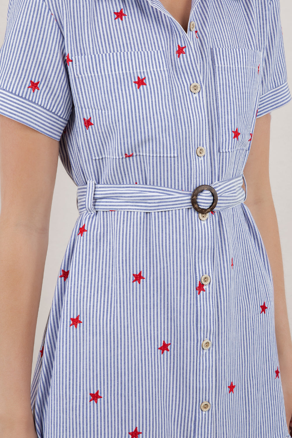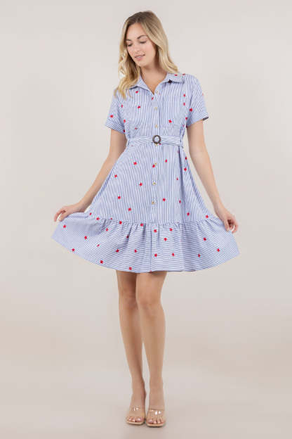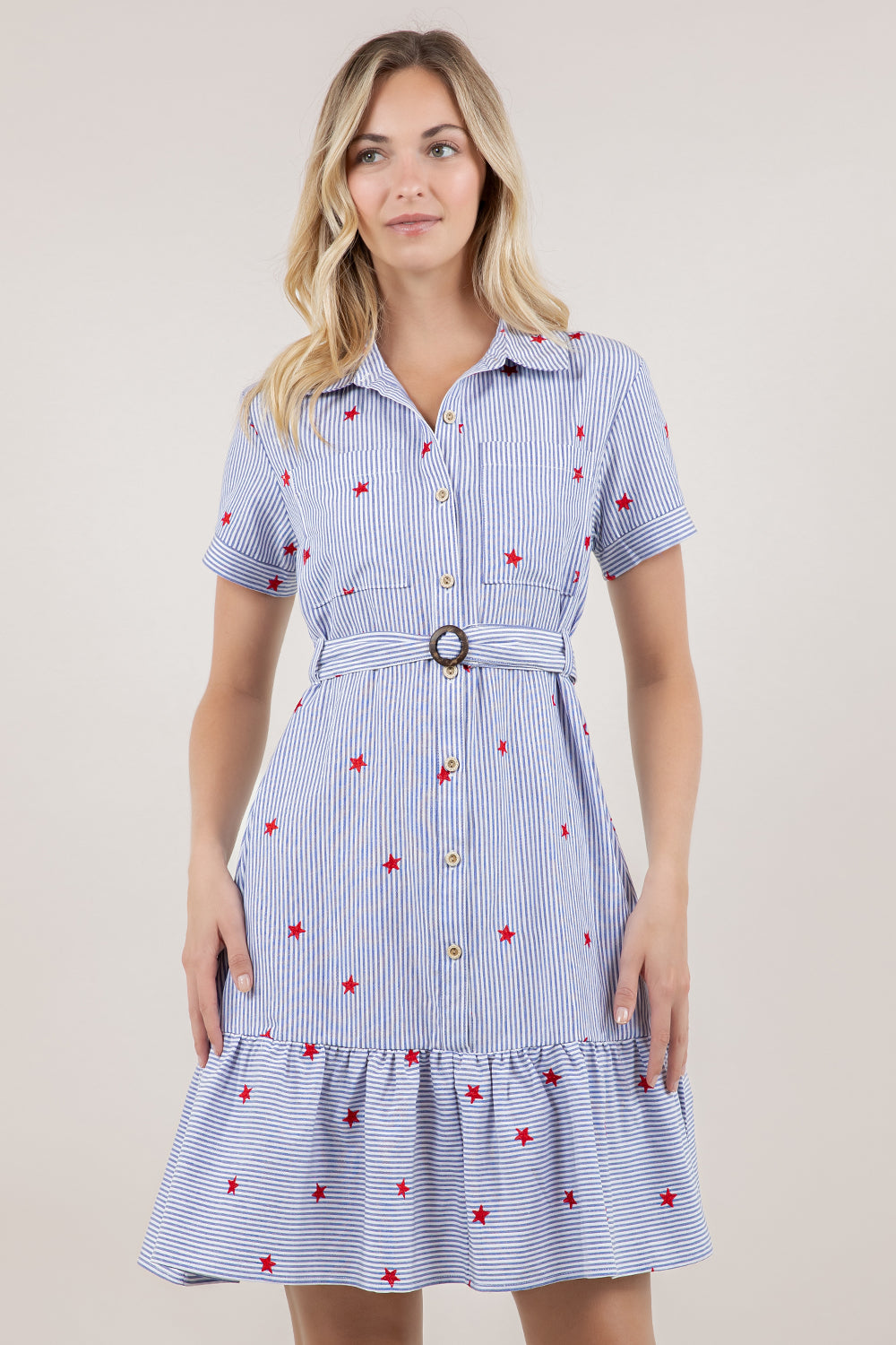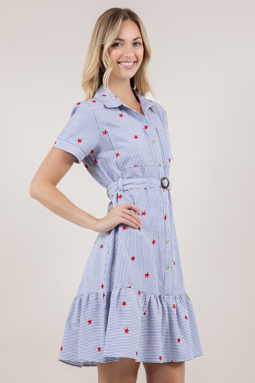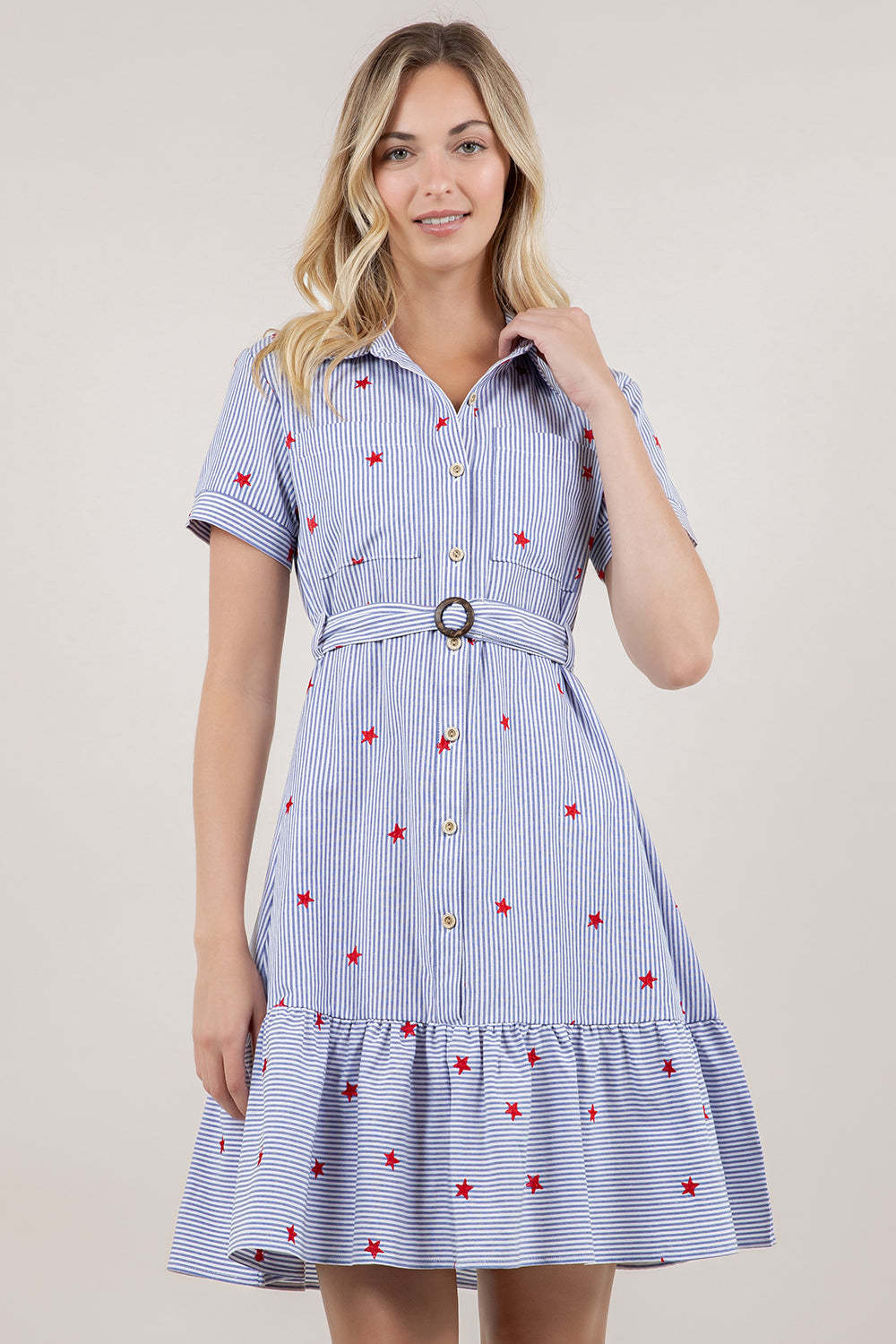 This short-sleeve shirt dress combines classic tailoring with playful details for a polished yet approachable aesthetic. Functional chest patch pockets and a full front placket deliver traditional shirt-dress appeal, while the crisp collar maintains a put-together appearance. Rolled cuffs add a refined finishing touch to the sleeves. A coordinating belt featuring a distinctive wooden buckle cinches the waist for definition and style versatility. The ruffled tier at the hem introduces movement and texture, elevating the silhouette with contemporary flair. An ideal piece for those seeking timeless sophistication with modern personality.