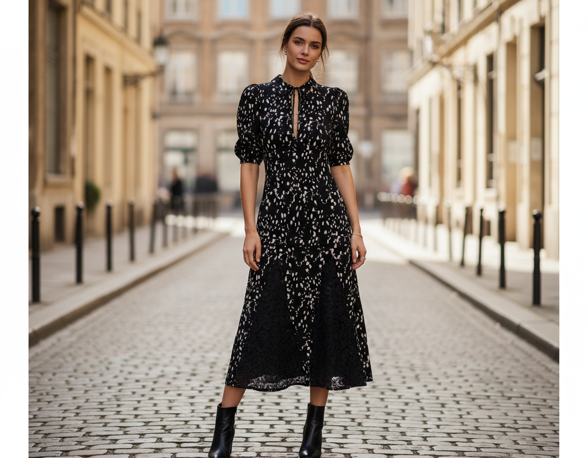 This midi dress combines timeless elegance with contemporary details. The adjustable keyhole neckline with tie closure offers versatile styling options, while short puff sleeves trimmed with ruffles add romantic flair. An empire waistline creates a flattering silhouette that flows into a fit-and-flare skirt. Lace contrast godets along the skirt flounce introduce sophisticated texture and movement. Perfect for occasions requiring polished, feminine sophistication.